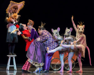 The weird uncle Drosselmeier (Billy Smith) is at the Christmas party, with his mechanical dolls, updated to a silver-spangled Barbie Doll (Elisa Clark) and a Robot with flashing lights (Spencer Ramirez). And of course, he brings the fateful Nutcracker, which will be broken by the bratty Fritz and will enter Marie’s dreams to fight the Mouse King and bring Marie to the Land of Sweets. In Morris’ ballet the choreographer adds an enactment of Hoffmann’s original story within the story, “A Hard Nut,” told to Marie by Drosselmeier. As in all the versions of the ballet, the characters in the dream world are reconfigurations of the real world.